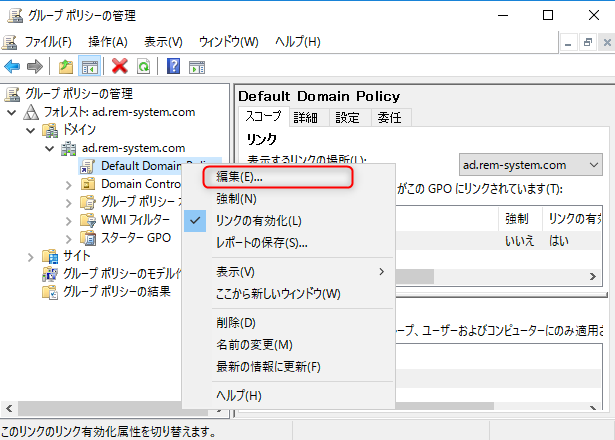 「Default Domain Policy」を選択し、右クリックしてサブメニューから「編集」を選択します。