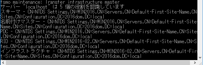 この結果から、本環境のFSMO機能を所有しているドメインコントローラーがWIN2016であることが確認できます。