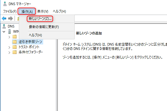 左ペインに表示されているゾーン名から「逆引き参照ゾーン」を選択後に、上部メニューの「操作」>「新しいゾーン」を選択します。